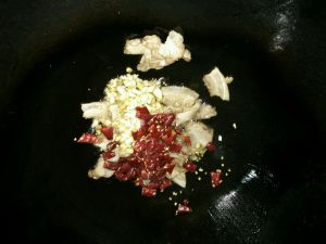 下郫县豆瓣酱、姜蒜,与腊肉翻炒几下,下包菜翻炒。