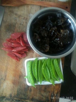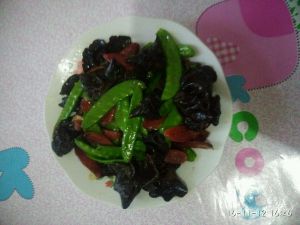 放入荷兰豆木耳,煸炒两分钟,加入少量水煮一会,然后加盐,鸡精,出锅了