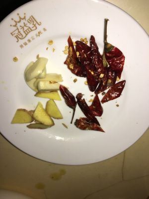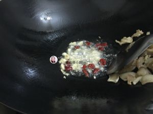 起油锅,倒入油渣,炒香,放入大蒜姜干辣椒炒香