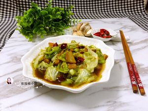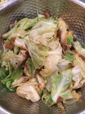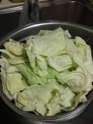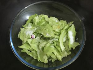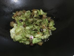 这时可以把软化了的包菜倒进炒锅中翻炒,软化了的包菜很容易熟,所以不能炒太久