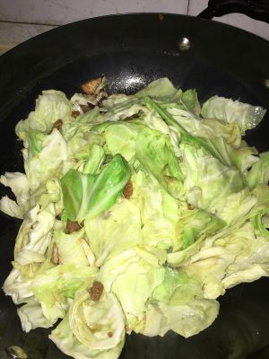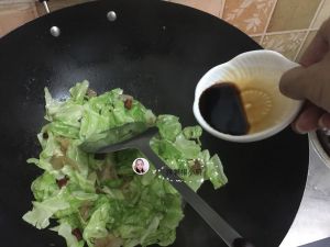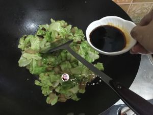 包菜叶翻炒片刻,加盐及生抽适量至炒熟