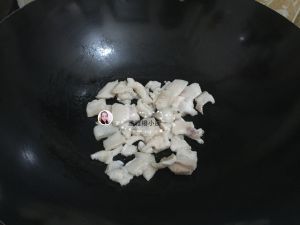 锅里把油烧热,把肉倒进去,炒出肥肉里面的油(看上去炒干了就行),炒干了之后,锅里会有很多油,把油倒掉,只留一点油