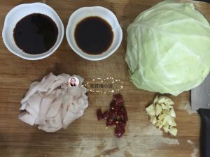 包菜洗净用手撕成小块儿(一定要用手撕,这样不但营养流失少而且没有铁器味儿~)辣椒,蒜切好备用,