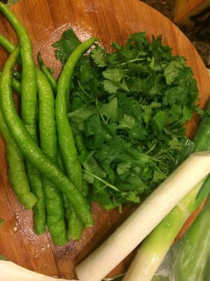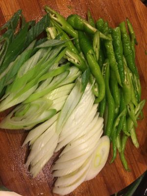 黄瓜洗净,切丝。葱白洗净,切丝;香菜择洗干净,切段;尖椒洗净,去籽,切丝。