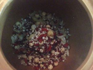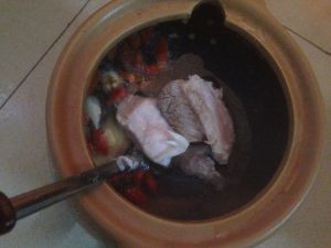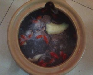 把上面全部汤汁倒入沙煲,加入适量水。浸泡的话把浸泡的水倒下煲中煲~