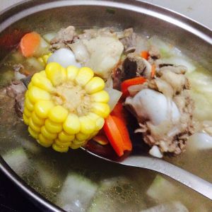 大火煮二十分钟之后放胡萝卜和玉米,放料酒,酱油,白醋,然后煮四十多分钟之后看下玉米和胡萝卜程度,然后转中火放冬瓜,再煮个半小时就OK啦,也可以多煮会,入味些。