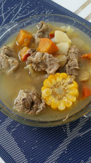 10分钟后放气,加玉米南瓜土豆块,适量盐,再加压5分钟。出锅后加适量鸡精。