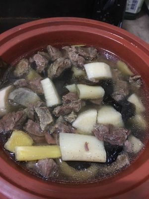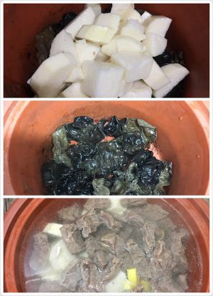 将银耳,山药,牛肉放入砂锅,加葱段,姜片,香叶,加水至没过,高火煮开后低火煲一晚上。