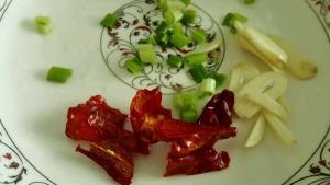 备好原料:干辣椒,蒜切片,葱切碎,花椒几颗~