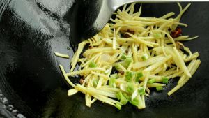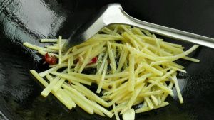 先锅里放进油、放入花椒和辣椒圈爆锅、在放入尖椒丝炒一会,在放入土豆丝和胡萝卜丝爆炒一下、放醋、味极鲜、花椒面、姜粉、味精、盐、大火爆炒、