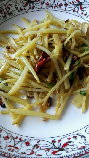 锅内放油,油热后依次放入花椒,蒜,干辣椒,有香味儿后立即放入在热水里牌焯一下下的土豆丝,翻炒~~