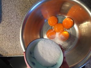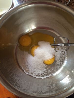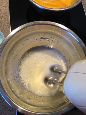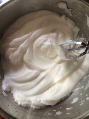 蛋白打至粗泡,分次加入细砂糖,打至偏硬的状态。放入冰箱冷藏待用。打发的时候蛋白里可以加几滴香草精哦。