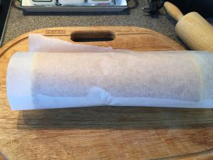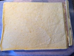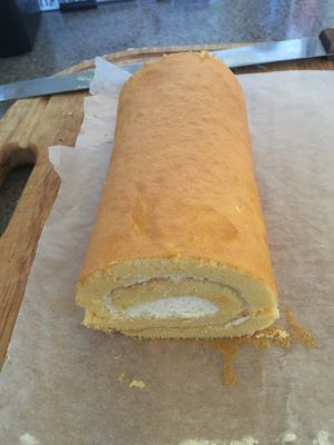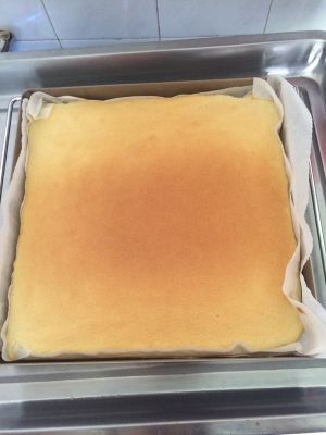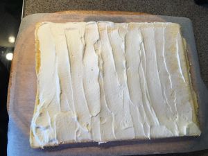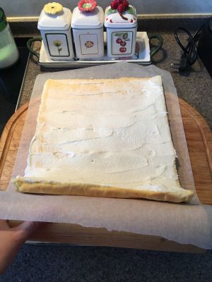 将奶油抹在蛋糕上,起始端和两侧涂满,起始端涂厚一点,收尾偏薄,尾部3厘米不涂,接擀面杖卷起。这个忘记拍了…