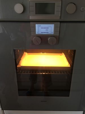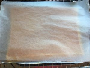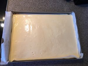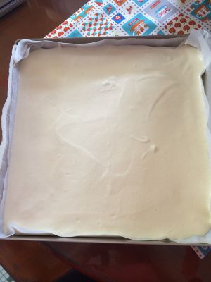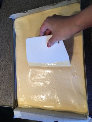 烤盘内放上油纸,将面糊迅速倒入,用小刮板刮平