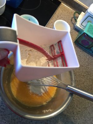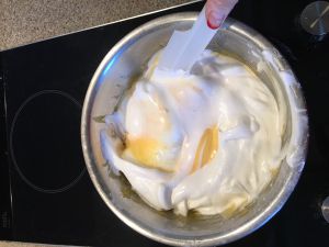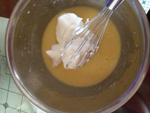 挑三分之一蛋白霜放入蛋黄面糊内,用橡皮刮刀切拌