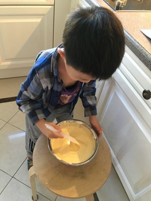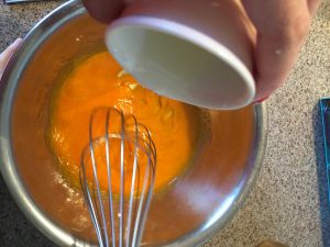 5⃣️打发的蛋清 分三次加入搅拌好的蛋黄中 继续搅拌均匀 烤箱160度预热