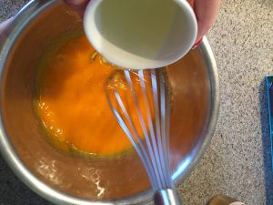 蛋黄加糖加油打至发白,糖融化。加入牛奶搅拌均匀。其实加水也可以,我知识觉得加牛奶更香。