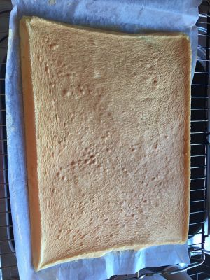 出炉震一下,过几分钟倒扣脱模。脱模的时候,烤网垫一张油纸,蛋糕直接扣在油纸上。