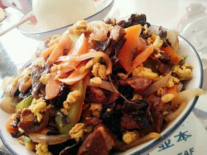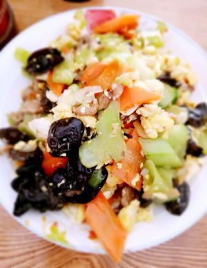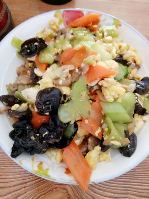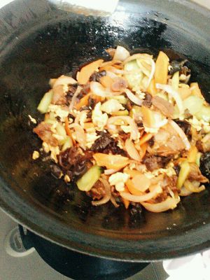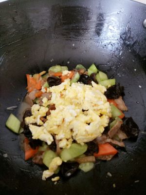 先炒鸡蛋盛出备用,然后放姜炒熟肉片、依次再下黄瓜、木耳,翻炒几下就好了,放入鸡蛋,倒入调好的汁,再放蒜、香油,出锅。