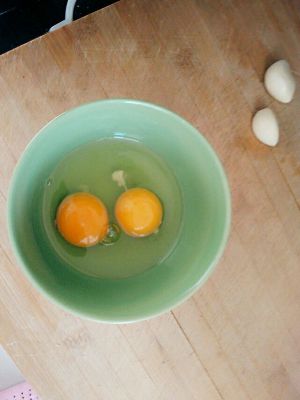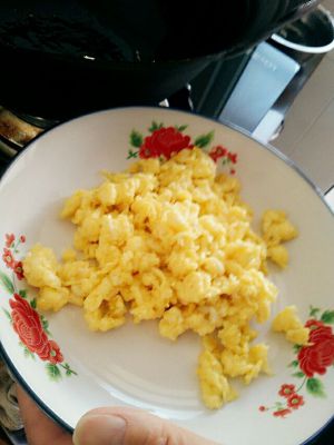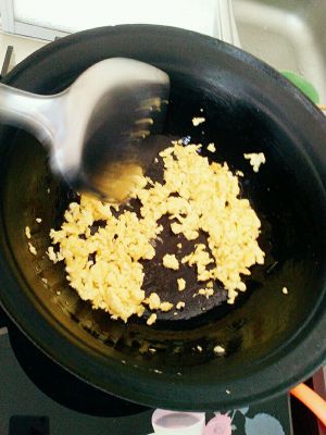 翻炒均匀后将炒好的鸡蛋盖在上面,火控制在文火和小火中间。