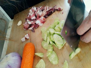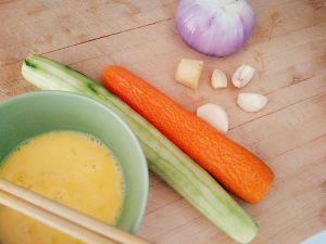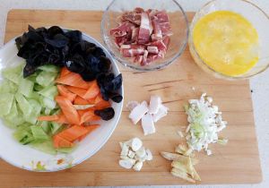 准备食材 黄瓜胡萝卜切片,木耳提前泡好, 鸡蛋打散(鸡蛋里面加了2克盐,这样吃起来有滋味) 猪肉切片(用一勺生抽,一勺淀粉,一勺料酒淹10分钟)