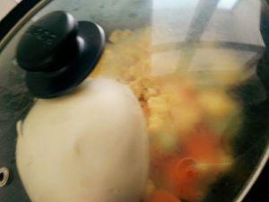 那出锅盖,倒水,上下翻一下,再闷煮5分钟
