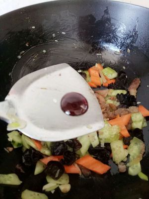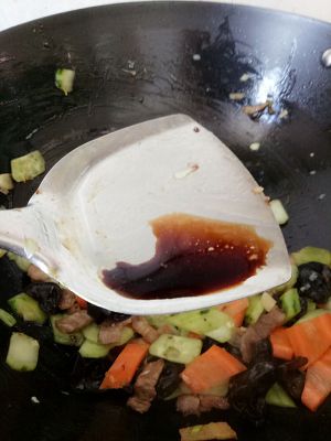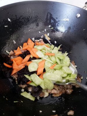 加入准备好的黄瓜,胡萝卜,木耳翻炒