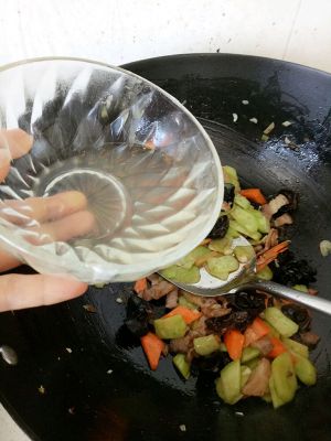 加入提前泡发至软并撕成小朵的黑木耳,翻炒几下;