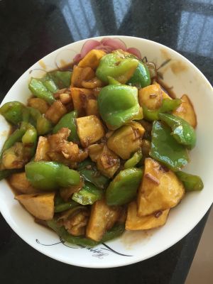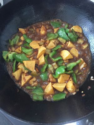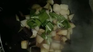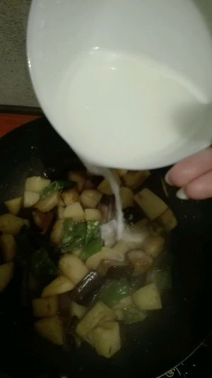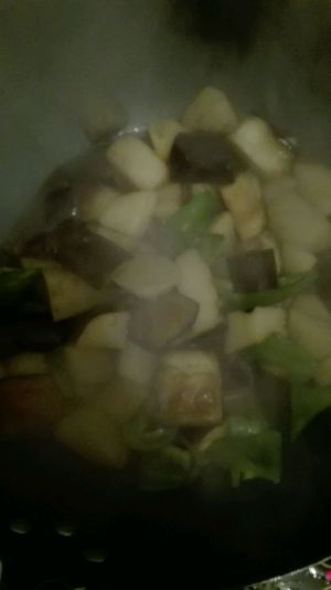 锅里油倒出,剩少量,放入葱末,蒜片爆香,然后倒入青椒块翻炒,放入油炸过的茄子,土豆,倒入勾好的酱汁,加半碗白水