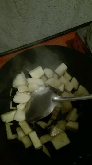 倒入调好的砂糖、生抽,翻炒至均匀上色后再炒约3分钟,让土豆、茄块吸收入味。