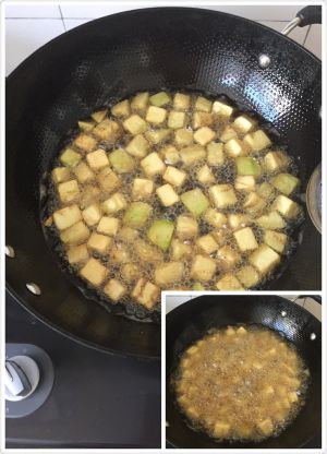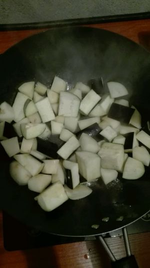 将油倒进锅里等油热了以后将土豆和茄子放进锅里过油 待土豆茄子变色后捞出