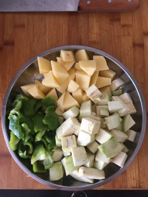准备工作:土豆、茄子均去皮,洗净切块;青椒去蒂、籽,切块。
