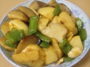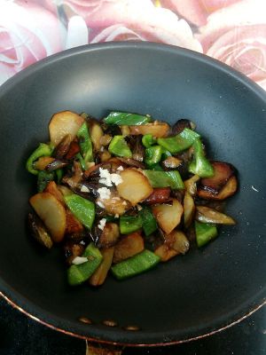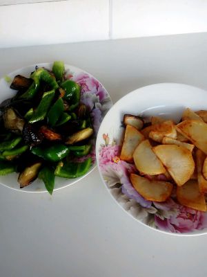 茄子是用煎土豆剩下的油煎的,差不多的时候倒入青椒,