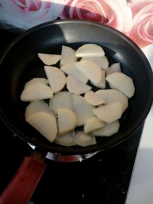 锅内少许油 小火将土豆煸至金黄盛出备用 以不沾粘为宜