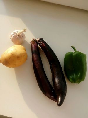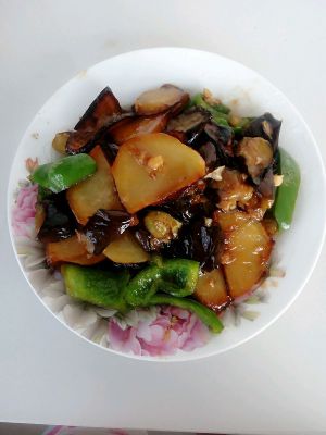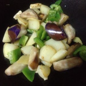 主材都切滚刀块,茄子用微波炉中高火10分钟。起油锅,放能炒2个菜的油量,炸土豆块和胡萝卜块,快熟了炸青椒,盛出备用。然后把茄子放下去炒,先看到油被茄子吸收了,小火慢慢的,然后油一点点又出来了,这时候就好了,