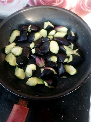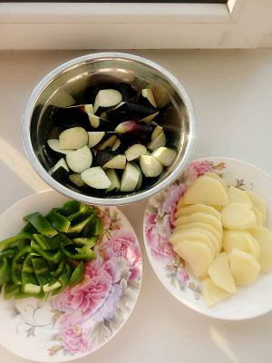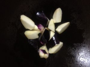 茄子切块。先热油锅,放茄子,翻一下,记得要煎透。煎好后起锅,待用。热油锅,放入土豆两面煎至金黄色后起锅,待用。