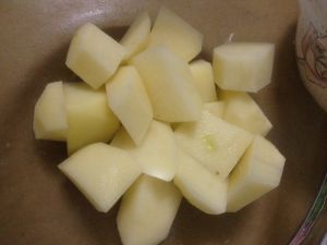茄子切滚刀块。土豆切稍微厚一点的片,青椒切块,