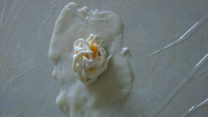 3 在桌子上铺一层保鲜膜,在涂点色拉油或橄榄油 用蒸好的皮子用小号擀面杖擀好 在放上芒果 奶油