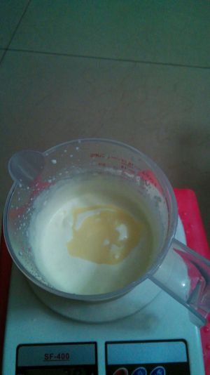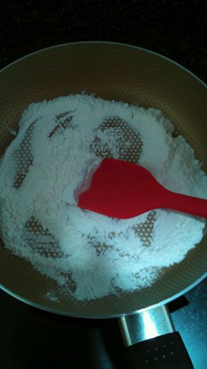 40克糯米粉放入平底锅,小火炒熟(面粉微黄)。放凉备用。
