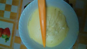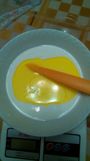 蛋黄打散混入,搅匀。180度预热入炉,10分钟后取出放凉。