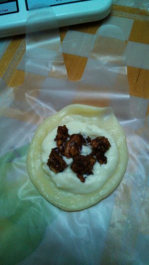舀上打发的奶油,放入适量的红糖核桃碎。像包包子一样摺边,包起,收口朝下放置。