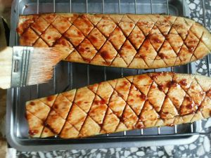 锅中放适量油烧5分热蒜末炒香倒入碗中,再把生抽,鼓汁油,辣椒,葱搅拌匀,在烤盘中垫锡箔纸,摆好茄子,再把调好的汁铺在茄子上。