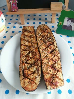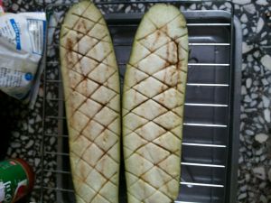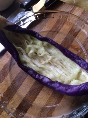 将茄子对半切,像切芒果一样,改刀成菱形。