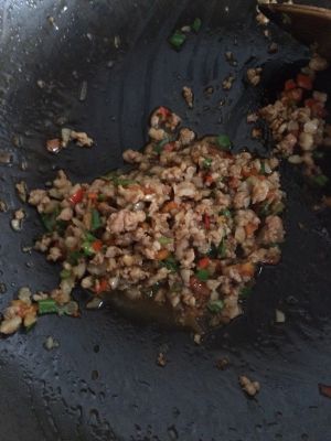 放入肉末 加入料酒 酱油 醋 白砂糖 翻炒入味