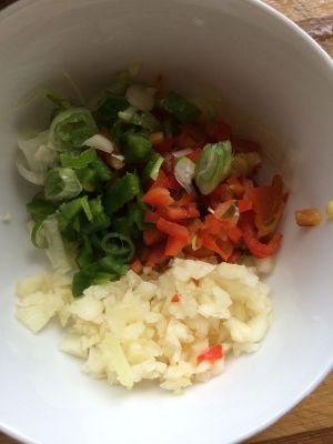 蒜,葱,辣椒切成末备用,茄子洗净擦干水分,横切成两分,再分别斜交叉打划刀撒些盐腌会。