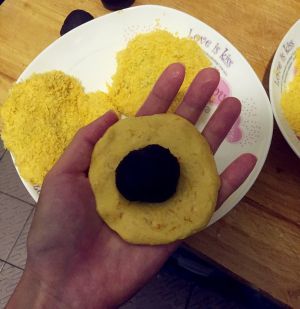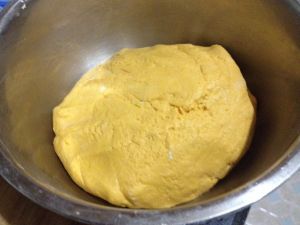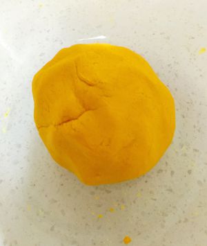 把南瓜蒸熟和糯米粉,面粉和成金黄色的面团