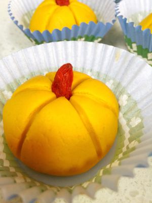 分成40克一个的小剂子,包入蜜豆,用牙签按压出南瓜的印迹。