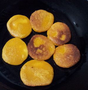 锅加热,刷油,揪小面团搓圆,再压扁,入锅小火煎至金黄,翻面再煎至金黄即可。喜欢吃脆皮的可煎到微微的焦黄色。