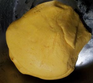 将蒸熟的南瓜压成泥,加糯米面、白糖、2勺山茶油揉成面团,饧20分钟(提示:先可加入和南瓜等量的糯米面,再可以根据揉的面团软硬和自己的喜好增添糯米面)