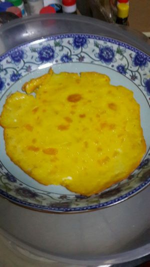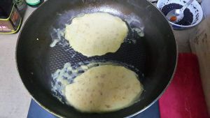 我是用家里的平底锅做的,如果电饼铛是最好的。锅底涂一层油,小火加热,把调好的糊糊倒入。一下不要放多,稍微薄一些。注意火候。要翻面煎,两面都要煎到。(图片不太美观,嘿嘿嘿,我这是第一次做的)